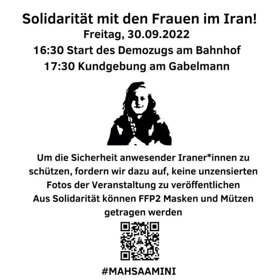 Am Freitag, 30.09.2022, ruft ein loser Zusammenschluss von Bündnissen, Organisationen, Parteien und Gruppierungen zur „Solidarität mit den Frauen im Iran“ auf!